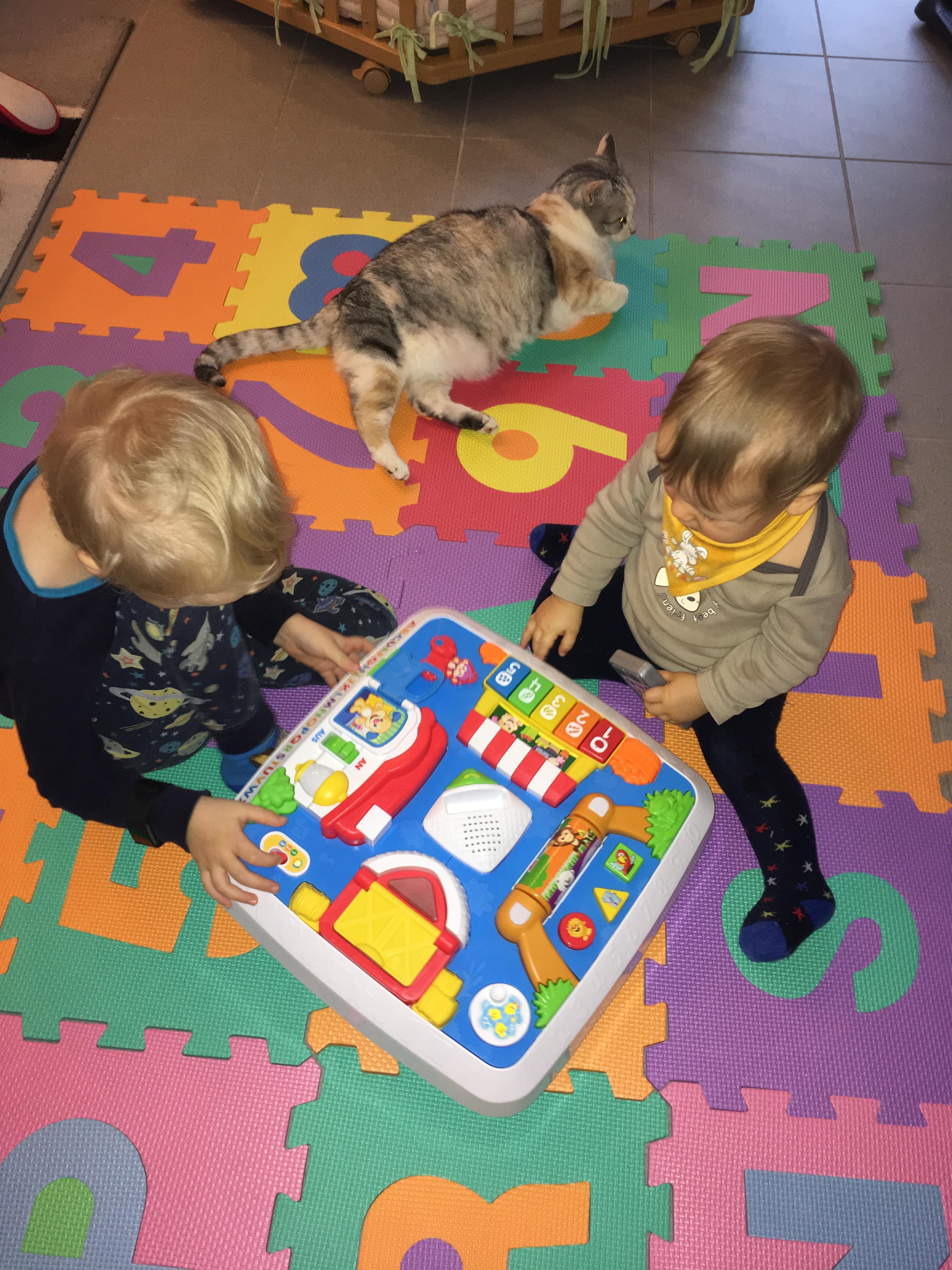Zu den verschiedenen Spielmöglichkeiten zur Schulung der Feinmotorik gehören ein mobiles Rollenspiel-Telefon, Schiebe- und Drehteile, Knöpfe und eine Tür zum Auf- und Zumachen.