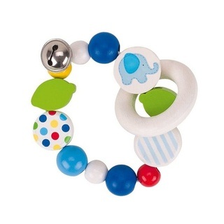 TOPSehr schöner Greifring, auch wenn er optisch nicht so bunt ist. Es macht unserer Maus großen Spaß darauf herum zu beißen und kann auch noch klappern. Es färbt nichts ab und ist schadstofffrei.
