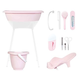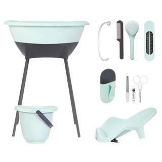 Das Set beinhaltet eine Babybadewanne plus Badewannenständer, Windeleimer, Badesitz, Maniküreset, Kamm, Bürste, Badethermometer und Abflussschlauch.