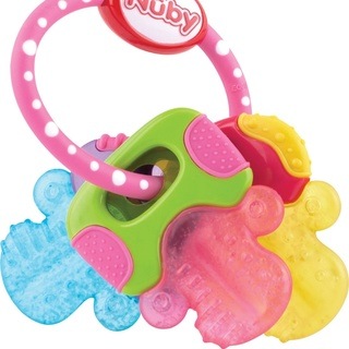 Kühlt länger als wassergefüllte Kühlbeißfiguren! Dieser innovative Beißring von Nuby unterstützt den natürlichen Zahnungsprozess und trainiert als Spielzeug die Feinmotorik der kleinen Hände. Das farbenfrohe Design und die strukturierten Oberflächen laden zum Spielen ein. Die Griffe der Schlüssel sind mit einer weichen, strukturierten Oberfläche versehen. Der untere Teil der Schlüssel ist mit ungiftigem Eisgel gefüllt, das wohltuend das angegriffene Zahnfleisch kühlt. Anwendung: - bitte nur im Kühlschrank kühlen - nicht im Gefrierfach! - nicht kochen, nicht sterilisieren - Reinigung mit warmem Wasser und Spülmittel, gut nachspülen. Entsprechend der RICHTLINIE 2011/8/EU DER KOMMISSION vom 28. Januar 2011 Bisphenol A frei.