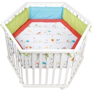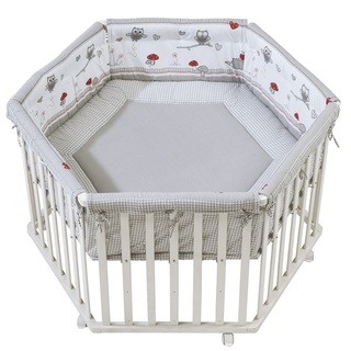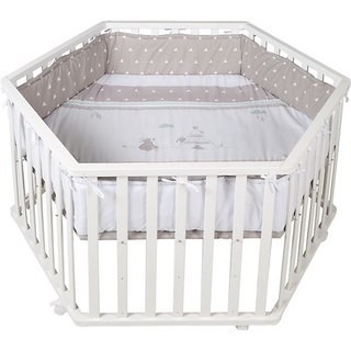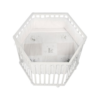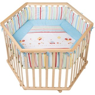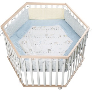 Dieses sechseckige Laufgitter INDIEBÄR aus dem Hause ROBA bietet Ihrem Schatz ein sicheres Spielfeld. Das Laufgitter kommt komplett ausgestattet mit einer waschbaren und weich gepolsterten Einlage und einem Bremsrollensatz. Der Boden kann in der Höhe 3-fach verstellt werden. Zunächst ist der Boden hoch eingestellt Ihr Winzling fühlt sich sicher und geborgen in seinem Reich und Ihr Rücken wird beim Herausheben geschont. Später kann der Boden nach und nach abgesenkt werden: Jetzt helfen die Sprossen bei den ersten Steh- und Gehversuchen. Lieferumfang: - Laufgitter - eine weich gepolsterte Laufgittereinlage - ein Bremsrolleneinsatz Maße: ca. 120 x 72,5 cm (Ø x H) Material: Liegefläche: MDF Rahmen: Schichtholz Seitengitter: Schichtholz Laufgittereinlage: Bezug: 65% Polyester, 35% Baumwolle Füllung: 100% Polyester Pflegehinweise: - Laufgittereinlage waschbar bis 30 °C - Trocknung mit reduzierter thermischer Behandlung Hinweise: Zerlegte Lieferung zur Selbstmontage. Eine leicht verständliche Montageanleitung ermöglicht eine problemlose Montage. BITTE BEACHTEN: Die Lieferung erfolgt aus speditionstechnischen Gründen frei Bordsteinkante. Es besteht kein Anspruch, dass Ihnen die Möbel bis in Ihre Wohnung getragen werden. Die Anlieferung erfolgt ggf. auf Einwegpaletten. Diese dienen zum einmaligen Transport und werden nicht getauscht oder wieder abgeholt.