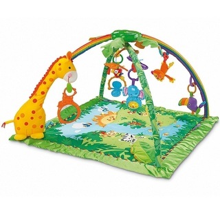 Die weiche Spieldecke mit ihren farbenfrohen Motiven wird Ihr Baby faszinieren! Musik, Naturgeräusche und Lichter fördern akustische und visuelle Fähigkeiten. Enthält einen Affen, einen Spiegel, einen Vogel mit Klingelgeräusch, einen Elefanten, eine Drehkugel mit Rasselperlen, einen Leoparden mit Dreh-Spielteil und ein Schmetterlingsmobile.