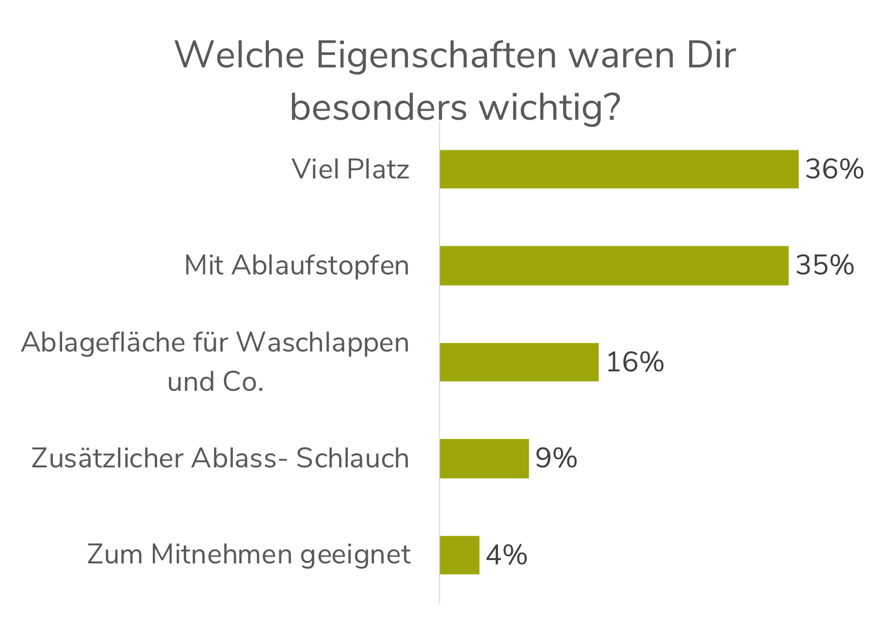 - Darüber hinaus spielt auch das Platzangebot im Bad eine wichtige Rolle: 14% entschieden sich für eine zusammenklappbare Wanne.