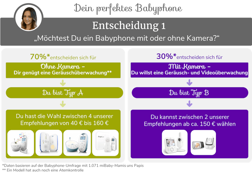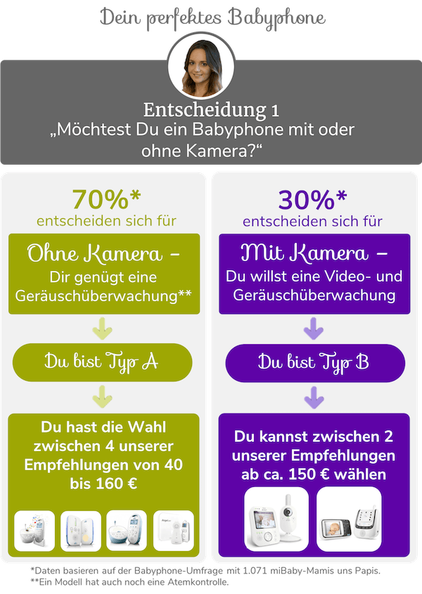 Schritt 2: Welche Alltagsbedürfnisse haben Eltern und welches Babyphone passt dazu? Bei der Begutachtung der vielen Babyphones war schnell klar, dass die Babyphone-Landschaft vor allem in zwei Bereiche aufgeteilt werden kann: Geräte mit und Geräte ohne Videofunktion. Für beide Elterntypen, also die, denen die Geräuschübertragung reicht, und die, die im Alltag eine zusätzliche Kamera haben wollen, habe ich daraufhin nach den Topprodukten gesucht.