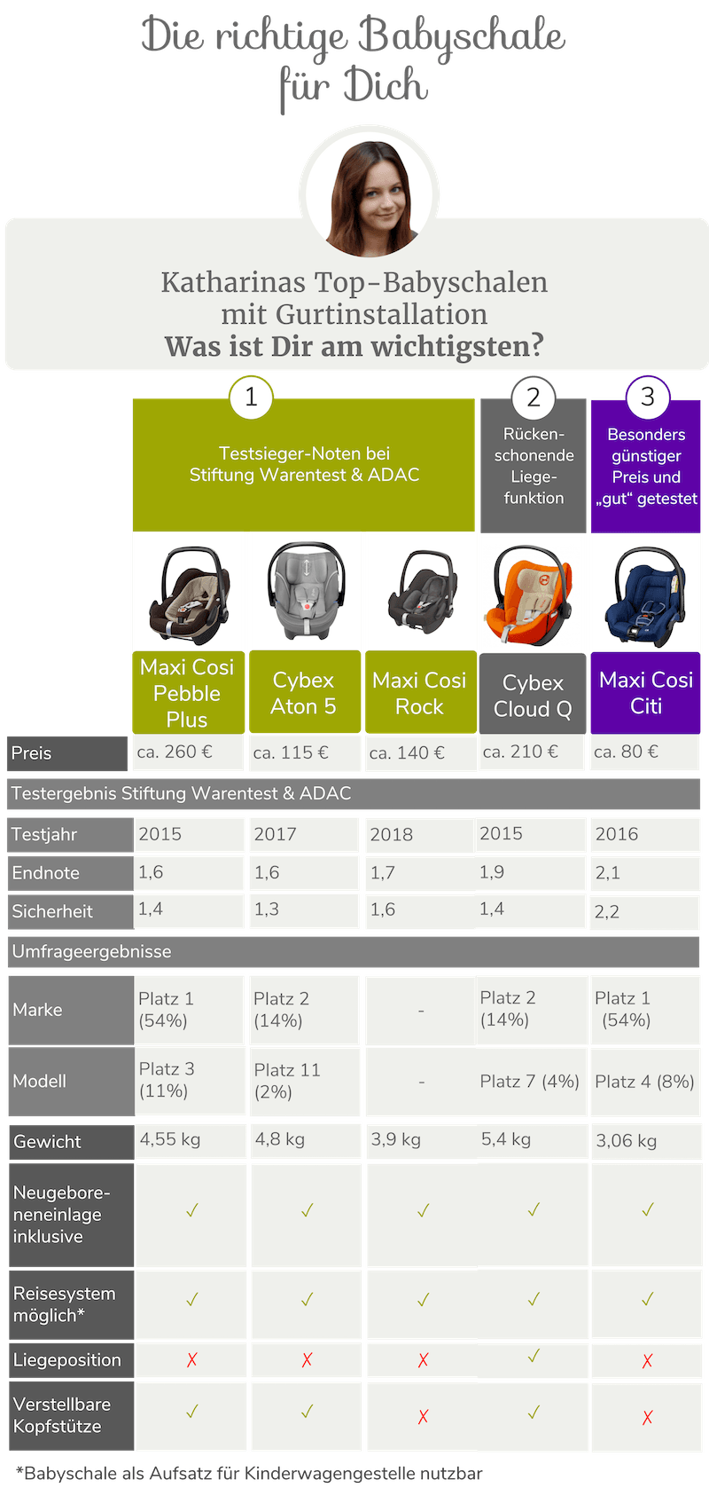 Aufgrund ihrer mehr als überzeugenden Endnoten mussten Platz 1 und 2, der Cybex Aton 5 und der Maxi Cosi Pebble Plus, natürlich auch in unserer Empfehlungsliste einen sicheren Platz haben. Darüber hinaus empfehle ich Dir den mittelpreisigen Maxi Cosi Rock auf Platz 4, den Cybex Cloud Q, weil er als einzige dieser Babyschalen über eine zusätzliche Liegefunktion verfügt und den Maxi Cosi Citi (Platz 12) aufgrund seines besonders geringen Sparpreises von nur rund 80 Euro und einem immer noch gutem Testergebnis.