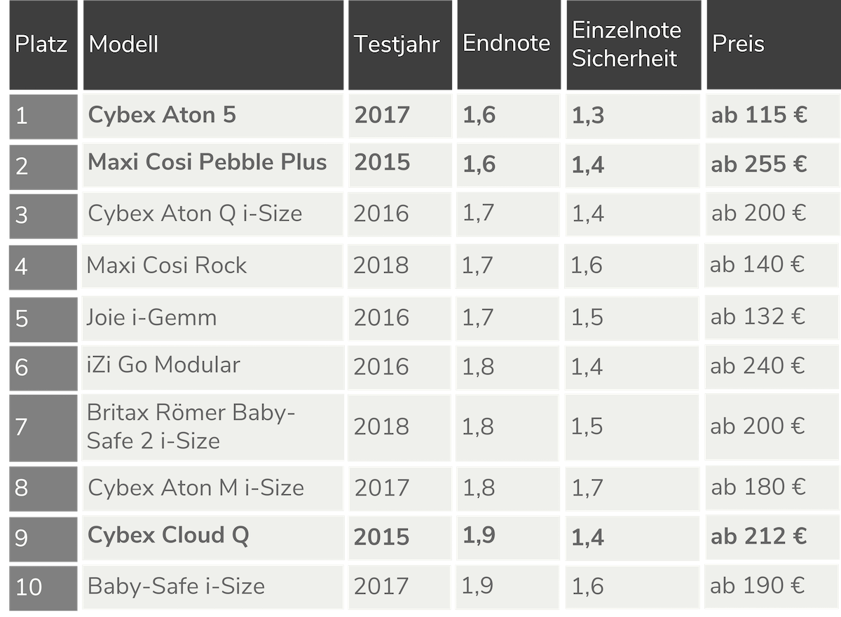 Mehr darüber, wie genau getestet wird und welche 10 Babyschalen seit 2015 die besten Endnoten erhalten haben, erfährst Du in unserem detaillierten Testergebnisse-Teil.